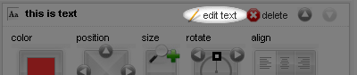 • Position: Select up/down, left/right. Or drag selected text around the design area by mouse.