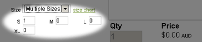 • From the Size dropdown, select 'multiple sizes'. Quantity boxes display all available sizes for that product.
